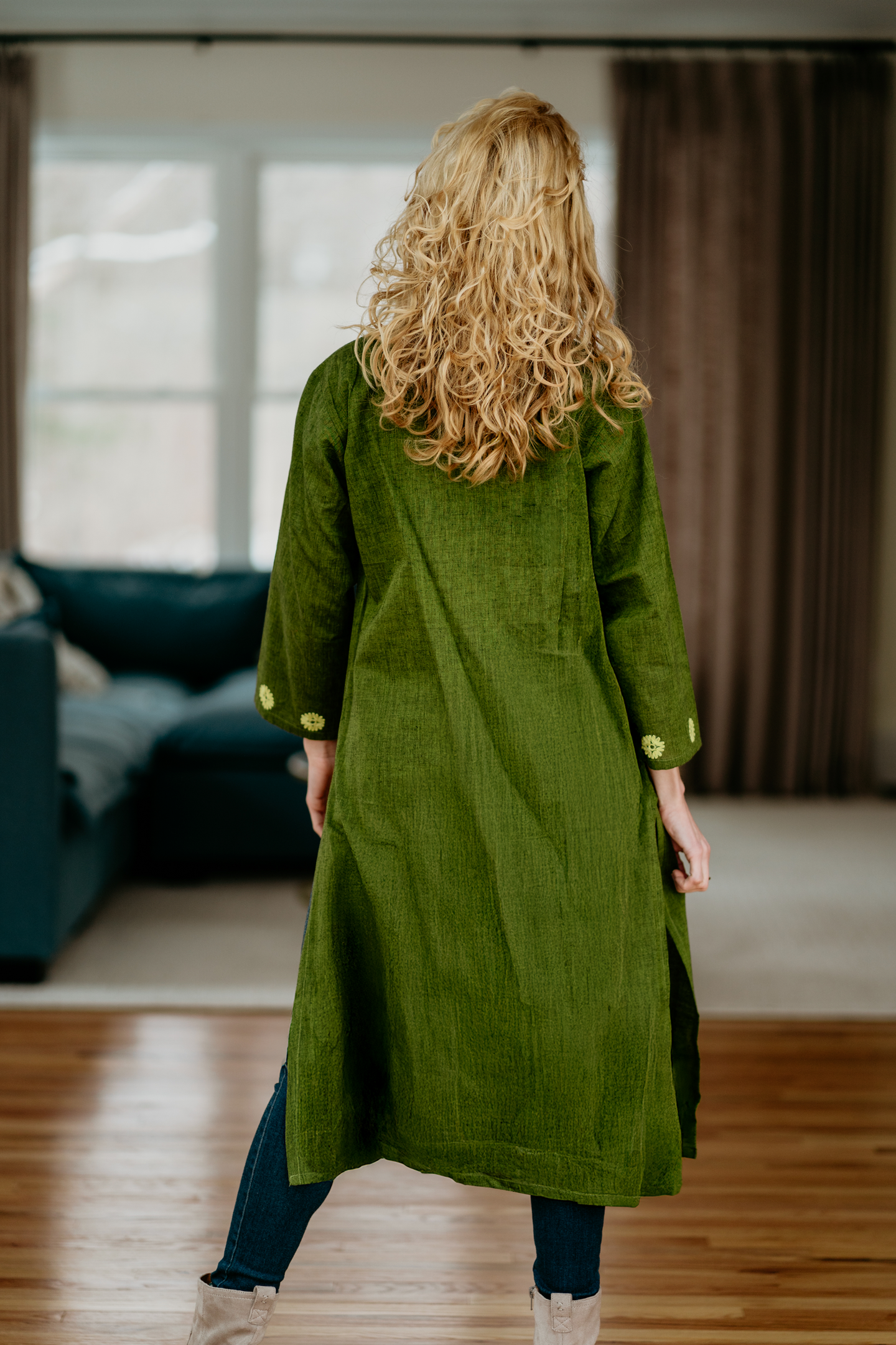 This is our long kurta, designed with side slits for comfort, a discreet pocket for functionality, and a flowing silhouette that layers beautifully. Looking for a shorter style? We also offer a tunic-length version. Our hand-embroidered linen scarf also pairs beautifully with this kurta, bringing the same craftsmanship and purpose-driven design to every wear.
